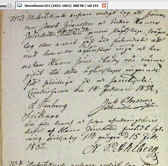 ning beviljades 1´ste gången d. 15. Febr. 1852 N.P.Ahlberg.