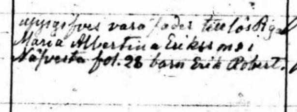 Uppgifves vara fader till lösliga Maria Albertina Erikssons i Näfvesta fol. 28 barn Erik Robert.
