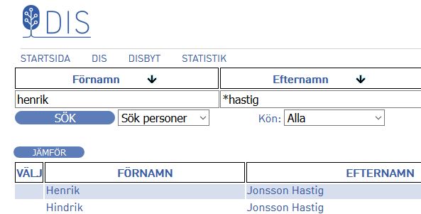 Om jag söker efter en Henrik Hastig och inte vet att han är inmatad som Henrik Jonsson Hastig i Disbyt (två efternamn), så får jag inga träffar. Om jag lägger på en asterisk för vänstertrunkering i efternamnsfältet hittar jag samma poster som visas i gamla Disbyt vid motsvarande sökning.