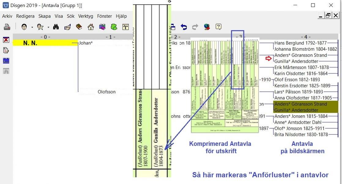 Då visas antavlan och din Anfader finns nu på två ställen i antavlan, vara den ena är Grönmarkerad = Anförlust